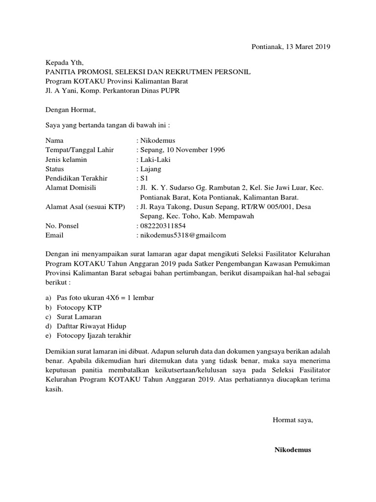 Contoh Surat Lamaran Kerja Fasilitator Download Kumpulan Gambar from gambarstatus.com Contoh surat lamaran kerja yang baik dan benar. Terusaja rt 01/ii, kota suramadu pendidikan terakhir: Surat lamaran merupakan surat permohonan yang dibuat oleh para pelamar pekerjaan atau pencari kerja, kemudian dikirimkan terhadap suatu badan usaha maupun instansi untuk mendapat pekerjaan maupun jabatan berdasarkan lowongan pekerjaan ditawarkan. Maka, tentu bekerja menjadi hal yang wajib bagi anda. Kita sering dilihat setiap ada job. Sudah cukup banyak contoh surat lamaran kerja yang terdapat di setiap job fair diberbagai tempat, dan juga berbagai kota sudah tentu akan mendapatkan banyak pengunjung. Akan tetapi, tak sedikit yang sulit membuatnya mengingat banyak faktor yang harus diperhatikan. Surat lamaran kerja adalah 1 dokumen untuk melamar kerja yang berisi tentang siapa anda, lowongan yang ingin anda isi dan mengapa anda cocok untuk.